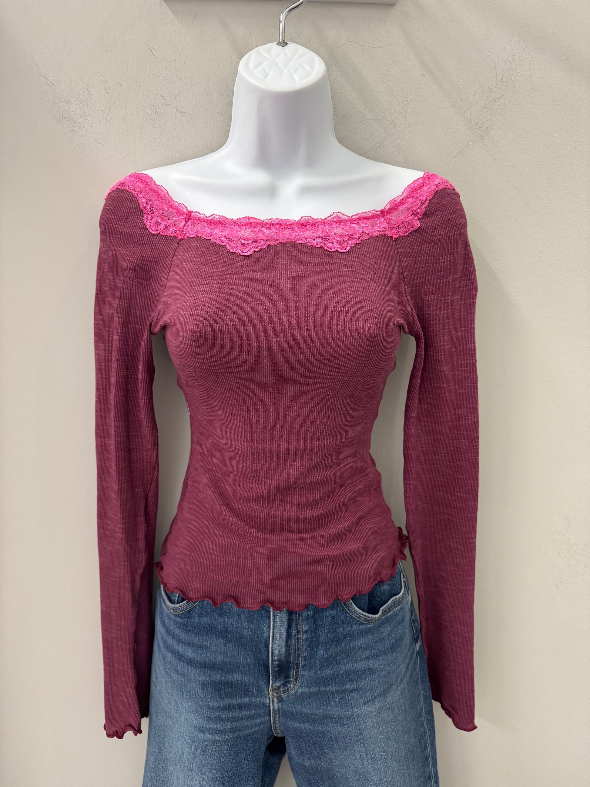 The perfect light-as-air long sleeve from our Oh My Darling collection, this essential top features a soft micro rib with delicate lace piecing at the neck and lettuce edged trimming for added dimension.