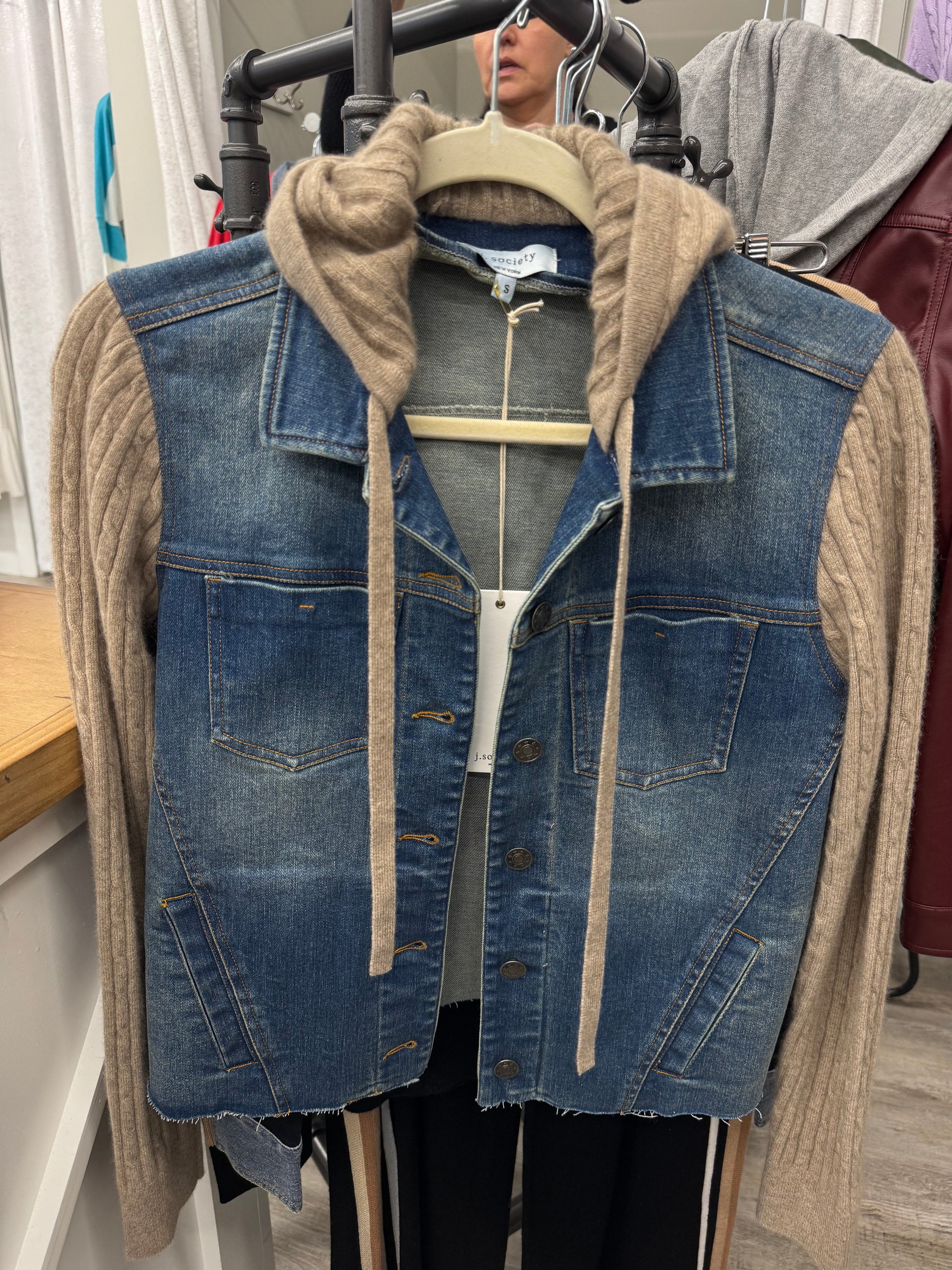 Elevate your wardrobe with the J. Society Denim jacket with cashmere sleeves and hood.