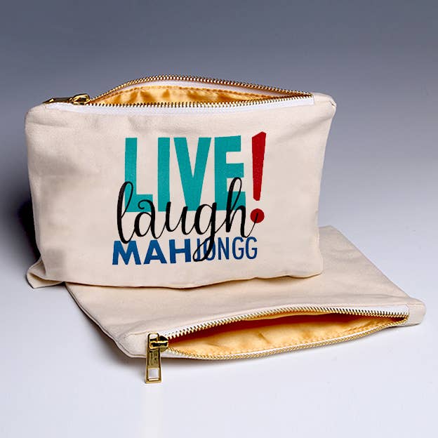 Who doesn't love Mah Jongg? A FUNctional gift, this cotton pouch is just perfect for cosmetics, change, car keys, odds and ends & all your stuff... Large pouch is lined and measures 9" x 6". Image is printed on one side. Can be personalized on reverse side. Packaged in a cellophane bag. These pouches are designed and hand-printed in my NJ studio.