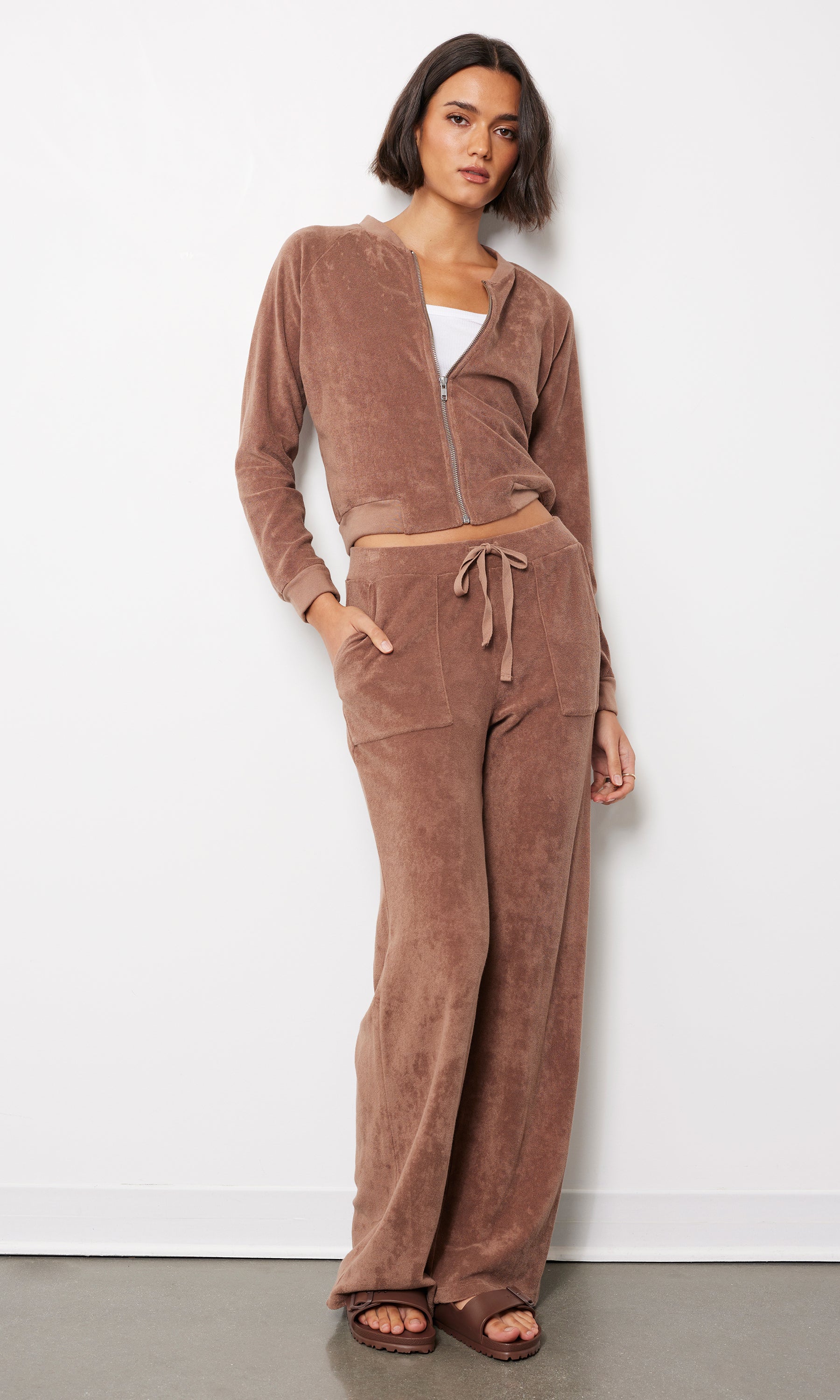 A wide leg silhouette with a ribbed waistband for an ultra-comfortable staple. Pair with the matching bomber jacket or any Spring-ready top for an effortless, yet pulled together, look.