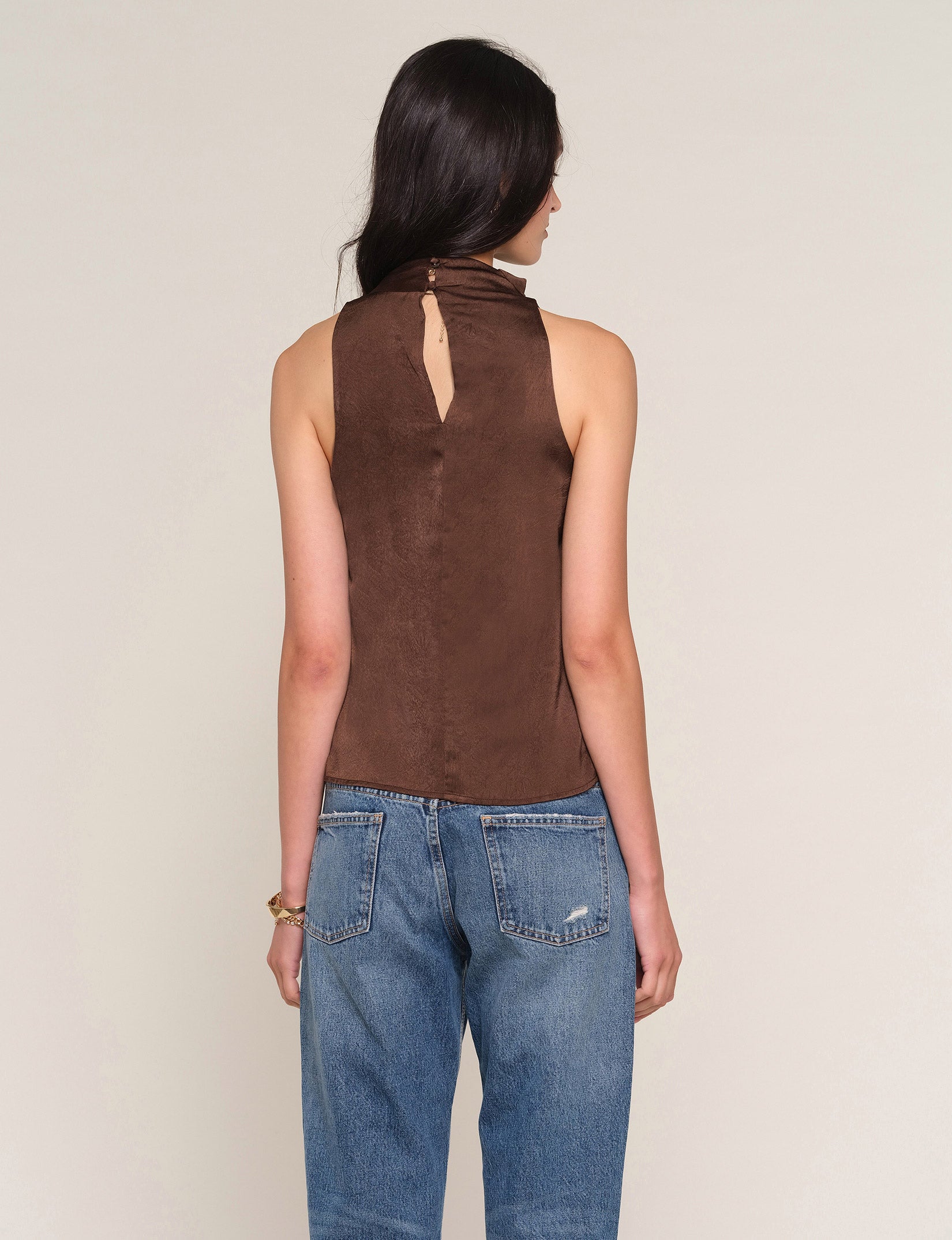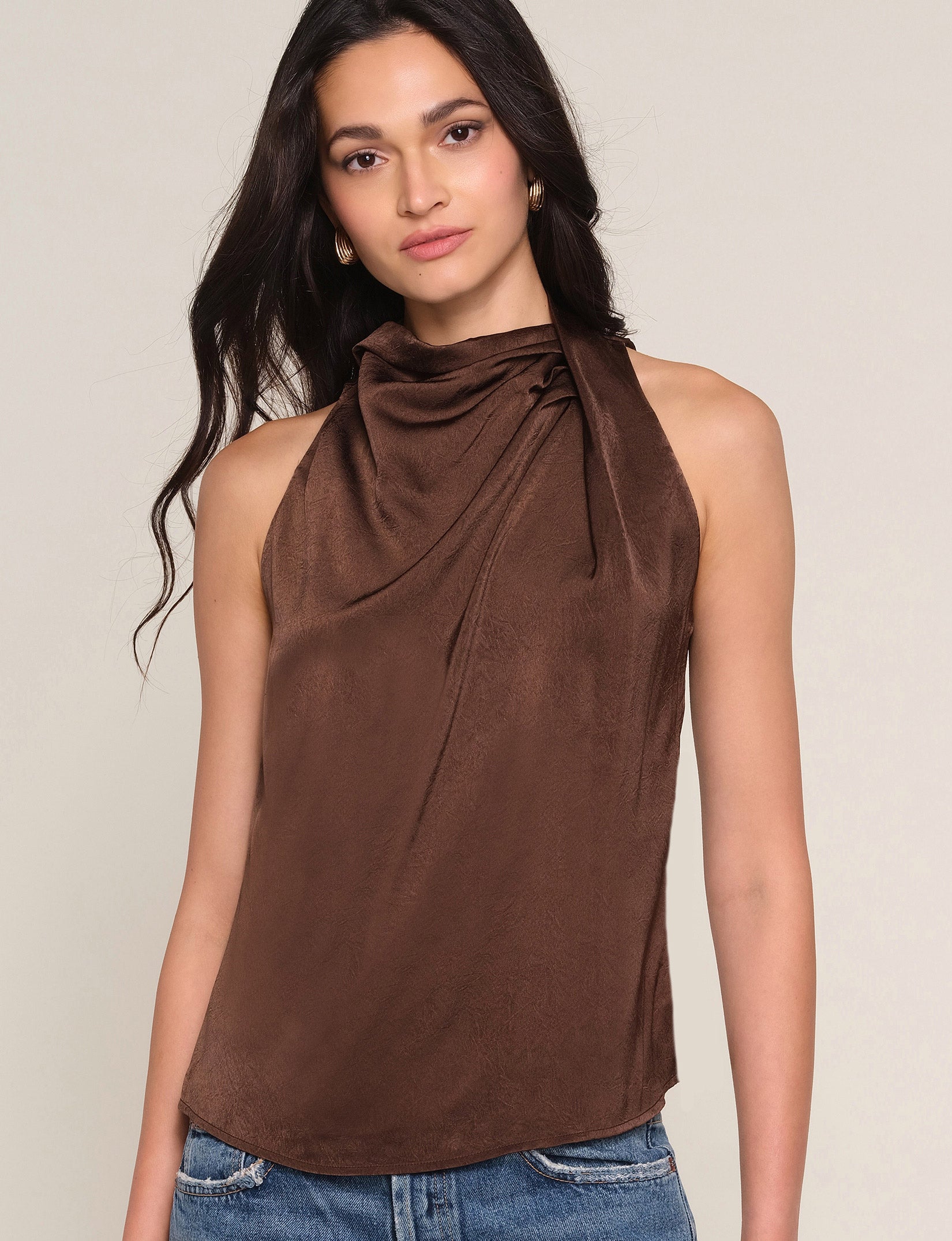 The Remonia Top is a soft, hammered satin blouse, with a draped neck. It has a relaxed fit, perfect for tucking into jeans.