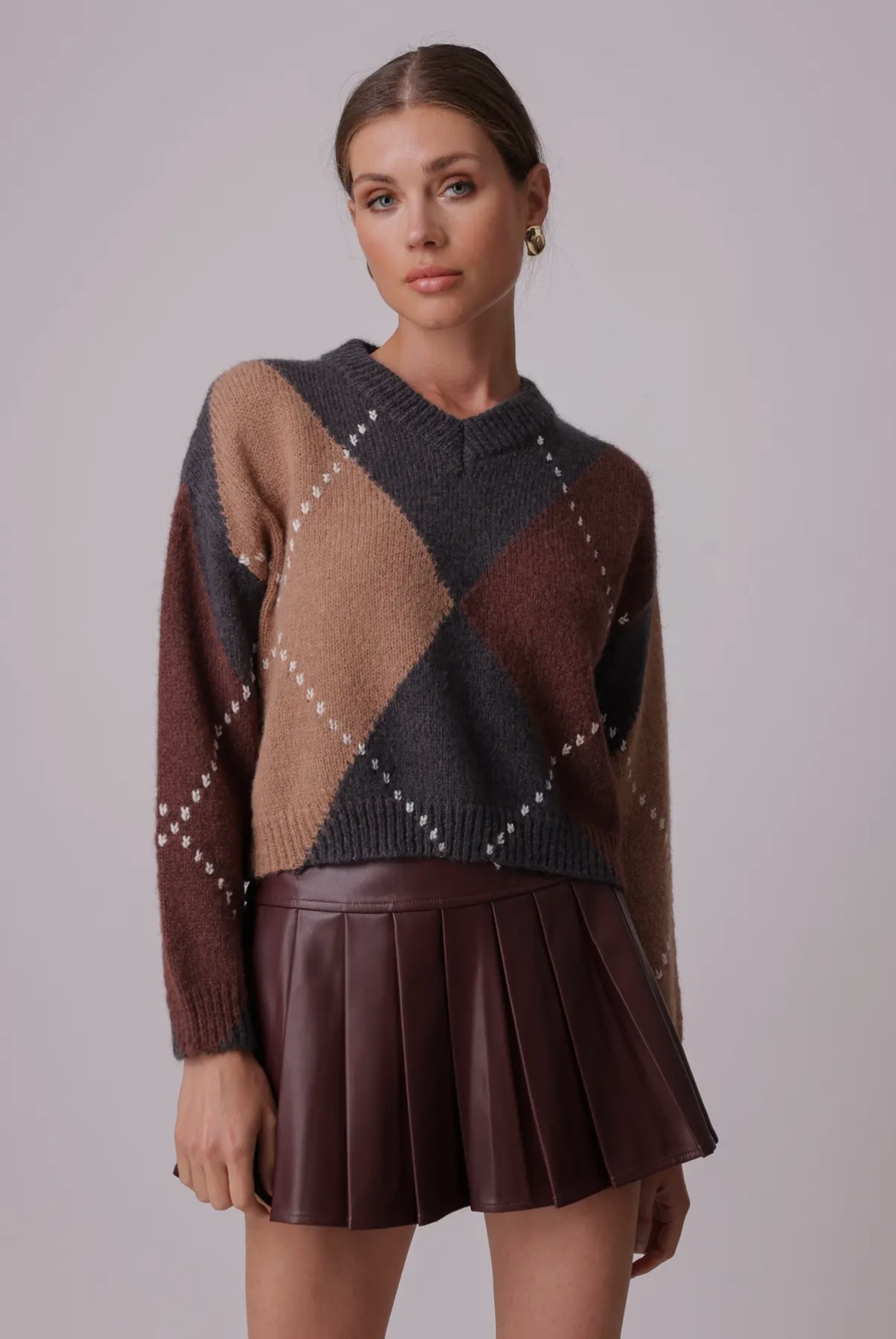 Get ready for Fall with this beautiful argyle sweater in charcoal and grey multi.
