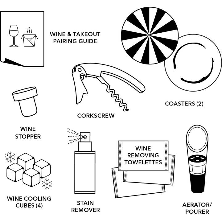 Our Wine Night Kit got a glow-up. And wine not? With handtied furoshiki-inspired packaging, we took one of our best-selling kits, and made it even more giftable. Inside includes 8 of the trendiest & convenient wine accessories & essentials such as: an aerator/pourer, 2 coasters, a corkscrew, wine stopper, 4 reusable ice cubes, stain remover spray, wine removing towelettes, and a wine & takeout pairing guide.